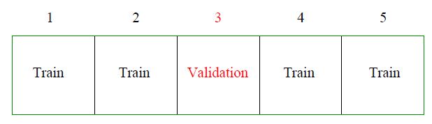 K-fold cross-validation approximates the prediction error by splitting the training data into K chunks as illustrated below (here \(K=5\)).