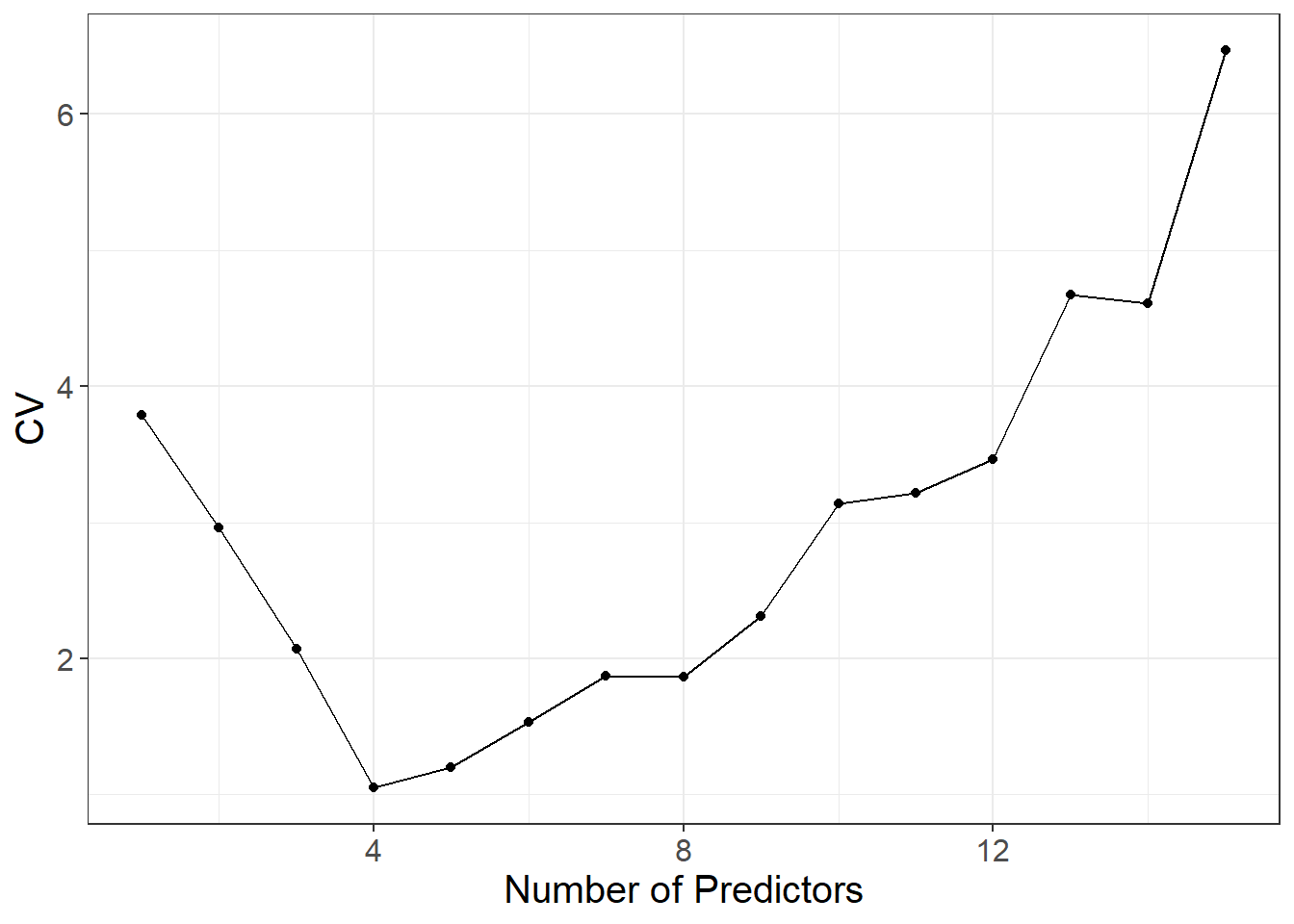 Each chunk is then used as “hold-out” validation data to estimate the error of \(m\)th model trained on the other \(K-1\) data chunks. In that way we obtain \(K\) error estimates and we typically take the average as the cross-validation error of model \(m\) (denoted by \({\rm CV}_m\)). The next plot shows a typical cross-validation error plot. This curve attains its minimum at a model with \(p_m=4\) (\(p_m\) is the number of included predictors in model \(m\)).