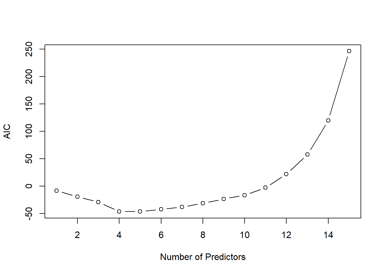 \[ {\rm AIC}_m=-2\;{\rm loglik}+2\;p_{m}. \] Thus, AIC rewards goodness of fit (as assessed by the likelihood function loglik) and penalizes model complexity (by the term \(2 p_m\)). The figure below shows for the same example the AIC curve. Also the AIC approaches suggests to use a model with \(p_m=4\) predictors.